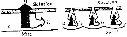 在阳极氧化过程中,含氧离子和铝离子在膜中强电场作用下向相反方向迁移。前者总是在膜与基体的界面上形成新膜物质,后者的情况比较复杂。在很高电流密度下,几乎全部铝离子都在膜与溶液界面上形成膜物质,电流效率接近100%,形成的膜为壁垒型(图5 a;图3 a、3b、3c,表4中性磷酸铵溶液中i=200Am-2时)。当电流密度减小时,向外迁移的铝离子有一部份形成新膜物质,另一部份则进入了溶液,因而η值减小。电流密度越小,形成膜物质的铝离子所占比例也越小,电流效率越低(图5 b)。当i=ic时,所有向外迁移的铝离子均进入溶液。这时,尽管膜仍为壁垒型(图5c、图1b、图2b),却完全是由含氧离子在膜与基体界面处形成的。若电流密度进一步下降,不仅向外迁移的铝离子全部进入溶液,而且膜的外表面受到溶液的侵蚀,形成许多孔洞,膜的形态变为多孔型(图5d、图2c、图3d、图4)。