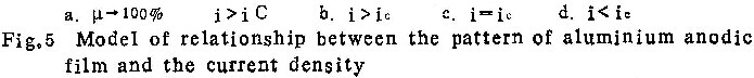 上述所有实验条件下标记氙原子层下方总有膜物质存在。这就是说含氧离子总是向膜与基体金属界面迁移并在此界面形成新膜物质。另一方面,在形成壁垒型膜时,标记氙原子层上方一般也有膜物质存在。它是由铝离子在膜与溶液界面处形成的。它的存在,表明了铝离子在膜生长过程中向膜外迁移。当电流密度i减小时,外层膜厚度减少。待ic时,外层膜不复存在,膜变为多孔型。还可看到,随电流密度的下降,阳极氧化后溶液中的铝离子数量增加,电流效率下降。它表明外层膜的减薄是由于部份铝离子进入了溶液;即使外层膜不存在,铝离子也是向外迁移的,只不过它们全部进入了溶液。根据这一分析,可以提出铝阳极氧化膜的模型(见图5)。