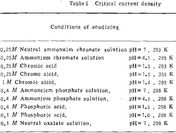 临界电流密度可作为判定氧化膜形貌的参数。表5列出本工作所测定的各种条件下的临界电流密度。可以看出: