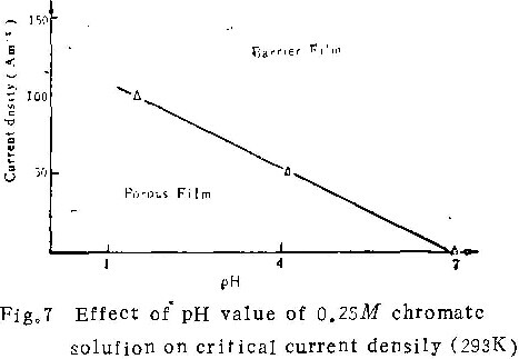 溶液的酸度值。溶液的pH值越高(到pH=7.0为止),临界电流密度越小。图7为在0.25M铬酸铵溶液中临界电流密度与pH值的关系。如果作出不同条件下临界电流密度与pH值的关系图,就可根据阳极氧化条件,断定生成的膜的类型。