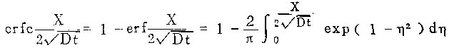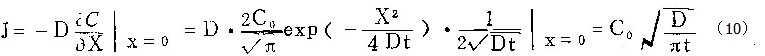 首先,可把溶液看成半无限大介质(X>0),而把样品看成与之相邻的另一个半无限大介质膜与溶液的界面位于X=0处,在恒电流方式下壁垒型膜生长过程中,达到平衡状态时,界面处铝离子的浓度保持在某一常数值Co(临界浓度)。铝离子的通量也是常数(因铝离子的迁移分数是恒定的)。铝离子向溶液深处的迁移,遵从扩散——漂移方程,但因支持电解质浓度很大,故可以不考虑电场的影响,而用扩散方程来描述