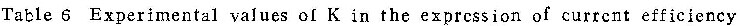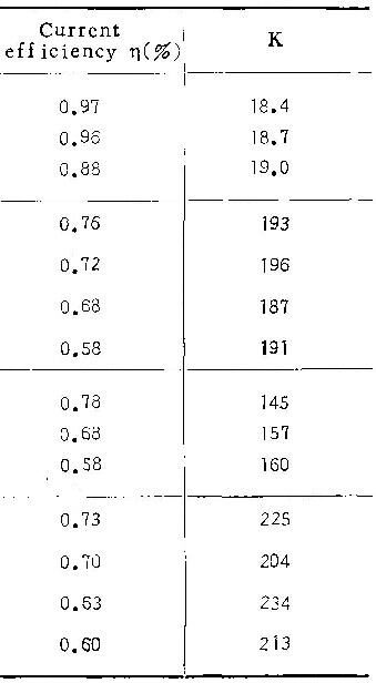 (13)式是在恒电流阳极氧化条件下,壁垒型膜生长的电流效率的理论表达式。由K之定义可看出,当电解质溶液条件不变时,K值为-常数,与电流密度无关。表6列出本研究工作几组试验所得出的K值。可见,在实验误差范围内,每种溶液中K值基本一致,与( 13)式预期的结果相符。